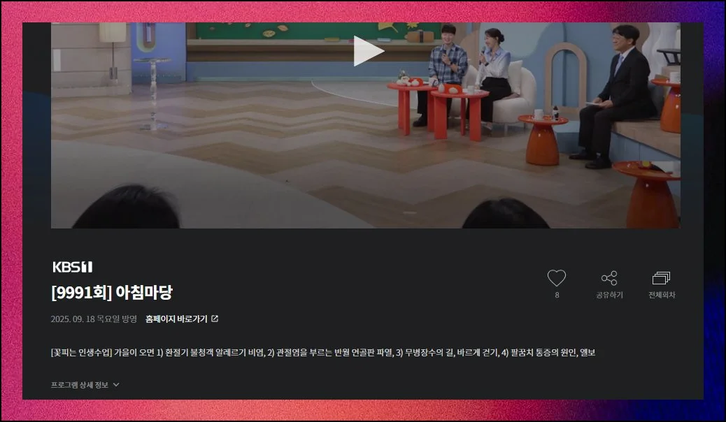 그 밖에도 꾸준히 사랑 받고 있는 인간극장이나 아침마당높은 조회수를 차지하고 있네요. 이렇게 KBS1 다시보기 서비스로 취향에 맞는 콘텐츠를 골라 감상할 수 있습니다.