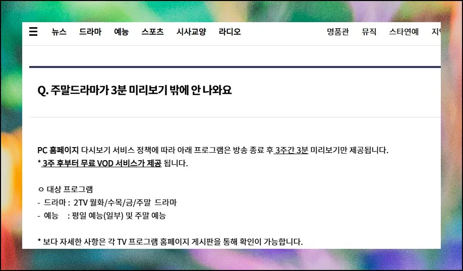몇몇 프로그램은 방송 직후 3주간 미리보기만 가능해요. 주로 인기 드라마와 예능이 이런 정책에 해당되는데, KBS1 다시보기 전편은 3주 후 자유롭게 볼 수 있습니다.